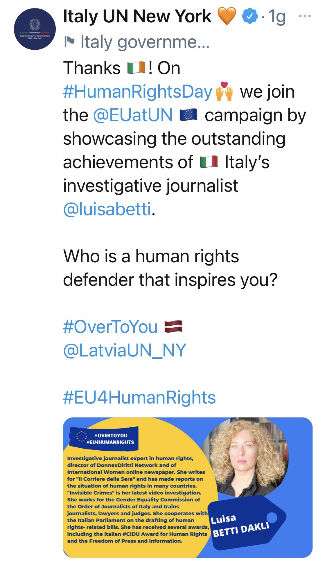 Luisa Betti Dakli, investigative journalist and DonnexDiritti Network’s editor was nominated as testimonial also by the United Nations, rapresenting Italy for the 2021 International Human Rights Day. Among them also Luisa Betti Dakli, a Roman journalist engaged for years in the storytelling of violence and in the defense of women: “I am proud to have received this award from the hands of President Laura Boldrini and I dedicate it to all survivors of domestic violence and to all unheeded mothers who are not protected by the Italian courts ”, says the journalist. “And in particular to Laura Massaro who has been in the grip of institutional violence for almost 10 years. I will be hapy only when women no longer will have to fight for their right to a life free from violence. When I started and chose to focus on human rights, I did not expect this type of work to be recognized as it is recognized today”.