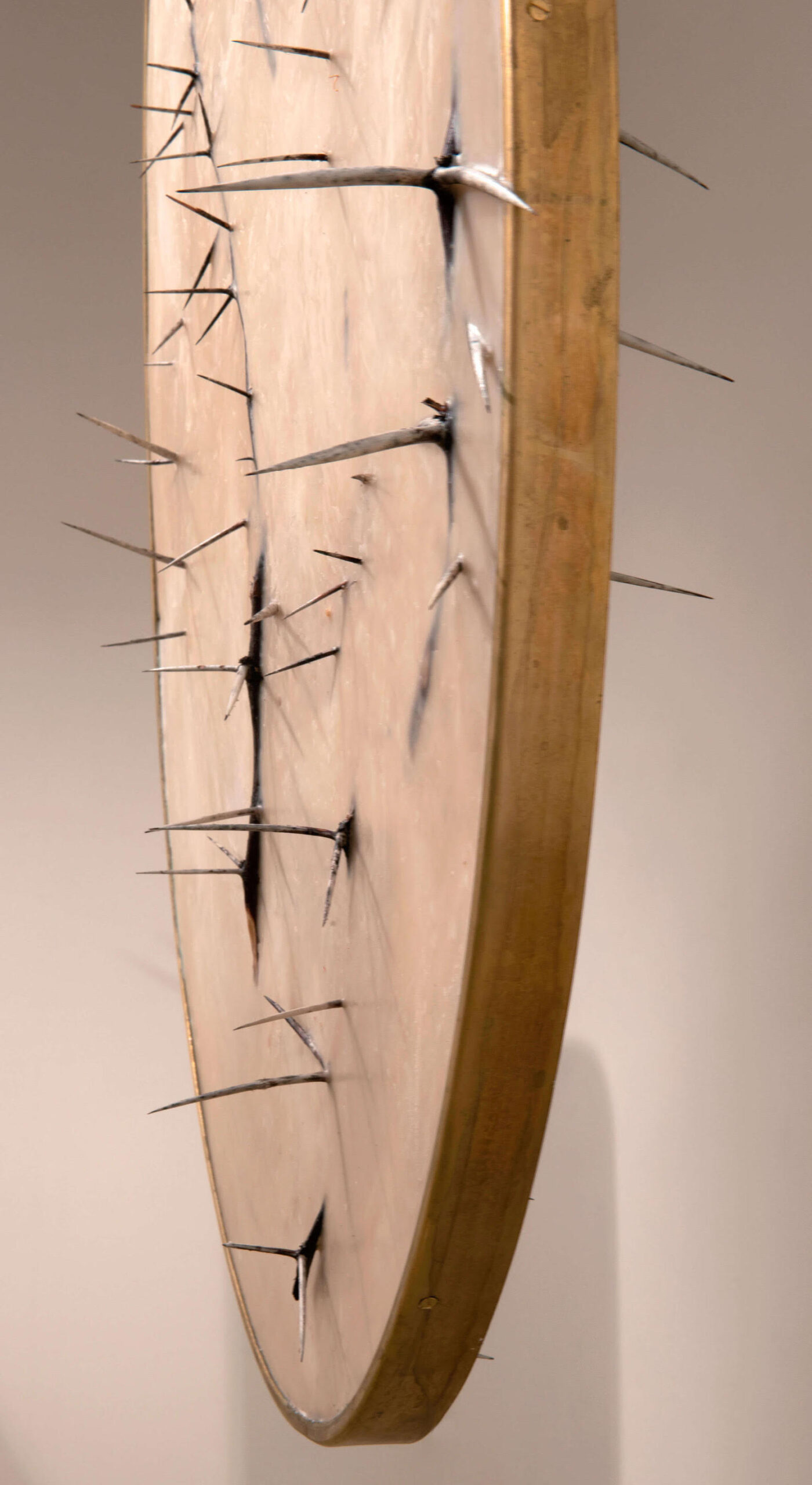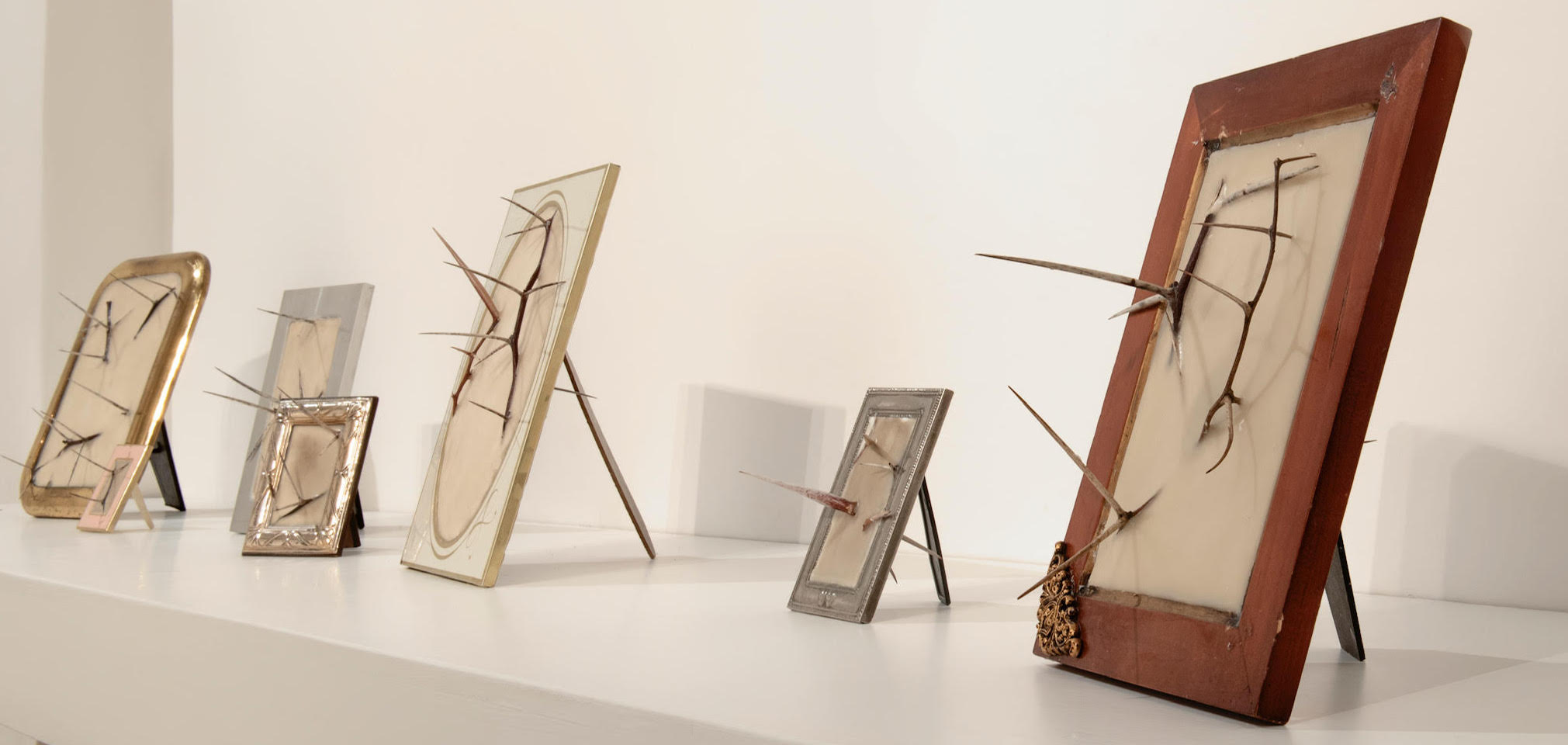 Qui il riferimento eroico è alla donna, a quella housewife che in Italia ha ancora totalmente sulle spalle tuttoil peso della vita domestica e l’accudimento della prole, che abbandona il lavoro dopo il primo figlio per mancanza di politiche di welfare, che non ha raggiunto la parità salariale e i cui diritti vengono costantemente messi in discussione. Tutte le opere di Silvia Giambrone sono realizzate in modo da creare un corto circuito visivo che permette agli oggetti di uso comune di diventare sinistri elementi di offesa. C’è quindi il preciso intento di portare alla luce il potenziale tetro, violento e crudo degli oggetti, perfettamente incarnato dalle serie dei “Frames” o dei “Mirrors” (2019), specchi e cornici di legno dorato che racchiudono dolorosi grovigli di spine di acacia, o dalla camera da letto miniaturizzata che diventa l’icona delle false famigliarità che costituiscono l’intimità di coppia.