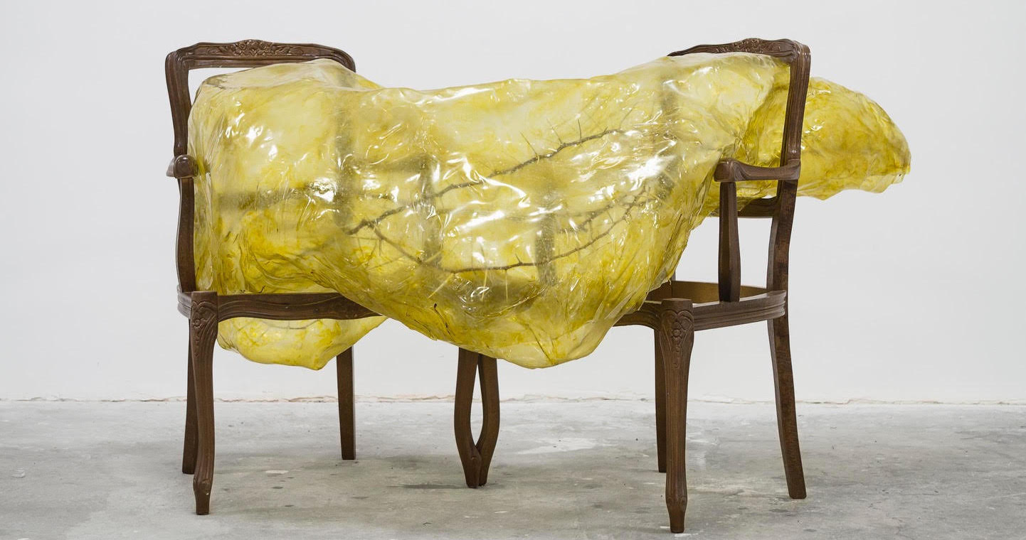 “Battlefield” (2017) è un tappeto persiano, tipico oggetto decorativo di una casa borghese, che però ha al suo centro una bruciatura circolare, riempita di fiori secchi e cenere, che ricorda più la desolata devastazione di un campo di battaglia che il confortante simbolo di un caldo benessere. L’opera “Senza titolo con spine” (2017) rappresenta due scheletri di sedie da salotto unite da una forma di plastica globulare al cui interno è germinata una selva di rami di acacia da cui spuntano lunghe spine acuminate.