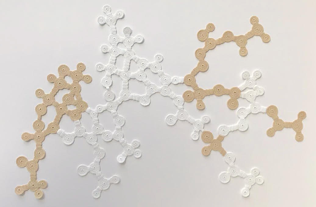 I suoi ricami sono la rappresentazione visiva della “Molecola dell’eroina”, un’operazione che ci fornisce una doppia lettura di un lavoro di arte applicata tipicamente femminile
