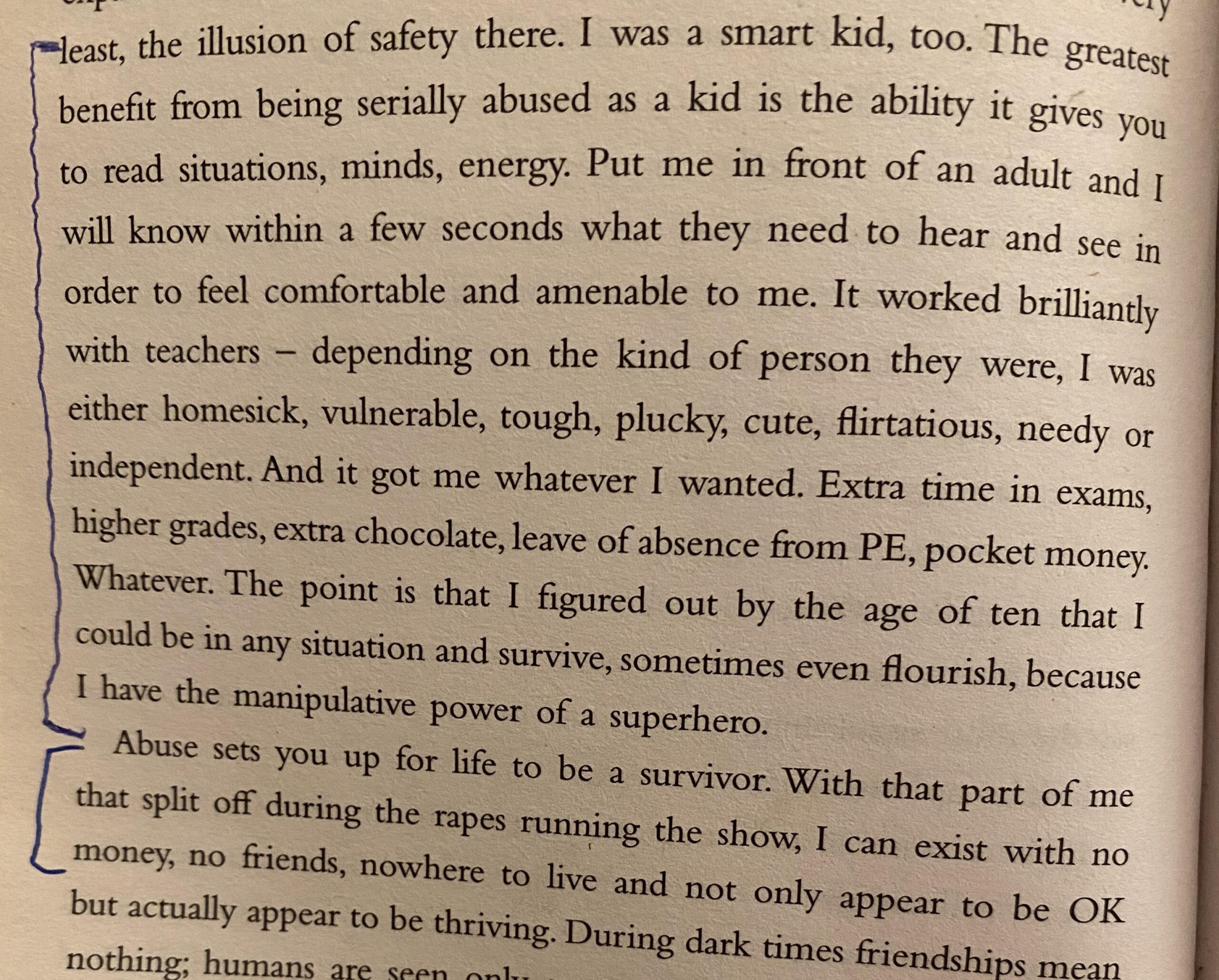 E ancora: “(…) mi stavo perdonando qualcosa che nessuno sano di mente avrebbe considerato una colpa da parte mia, ma di cui io mi accusavo dall’età di 5 anni”