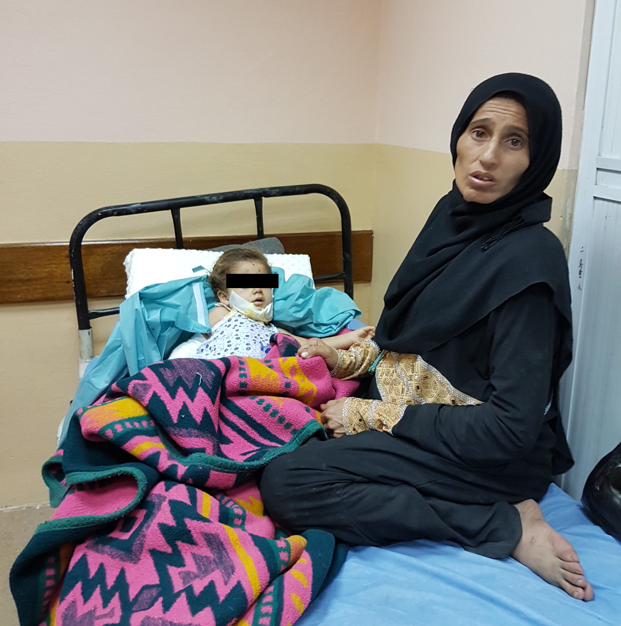 lei Era sul letto della figlia più piccola colpita su tutto il corpo dalle schegge di una mina anti uomo incontrata sulla strada mentre fuggivano dal DAESH